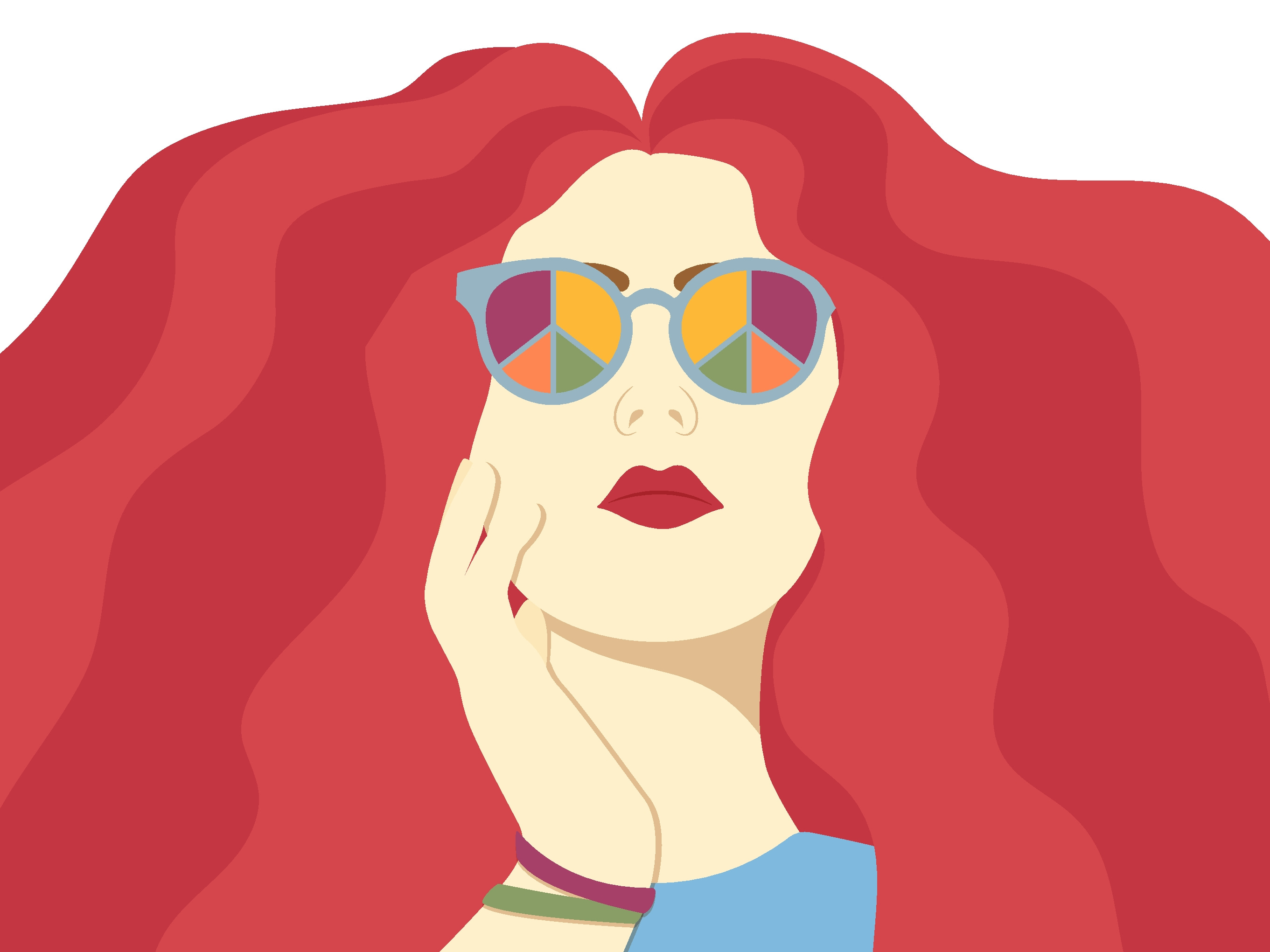 She wore Oshkosh overalls with the legs cut off high as hot pants and the edges frayed just-so to create a stringy decorative fringe. She was braless again, with one strap of her overalls undone in a way that exposed the curve of her left breast under a thin tank top that was tie-dyed in swirls of red, pink and purple. That wild red hair framed her rose-tinted, wire-rimmed sunglasses, round and oversized like the ones Janis Joplin wore on the cover of Rolling Stone magazine. Three inches of bangles jangling on each wrist, and on her feet tan leather work boots with bright red shoelaces. I didn’t even know red shoelaces existed.