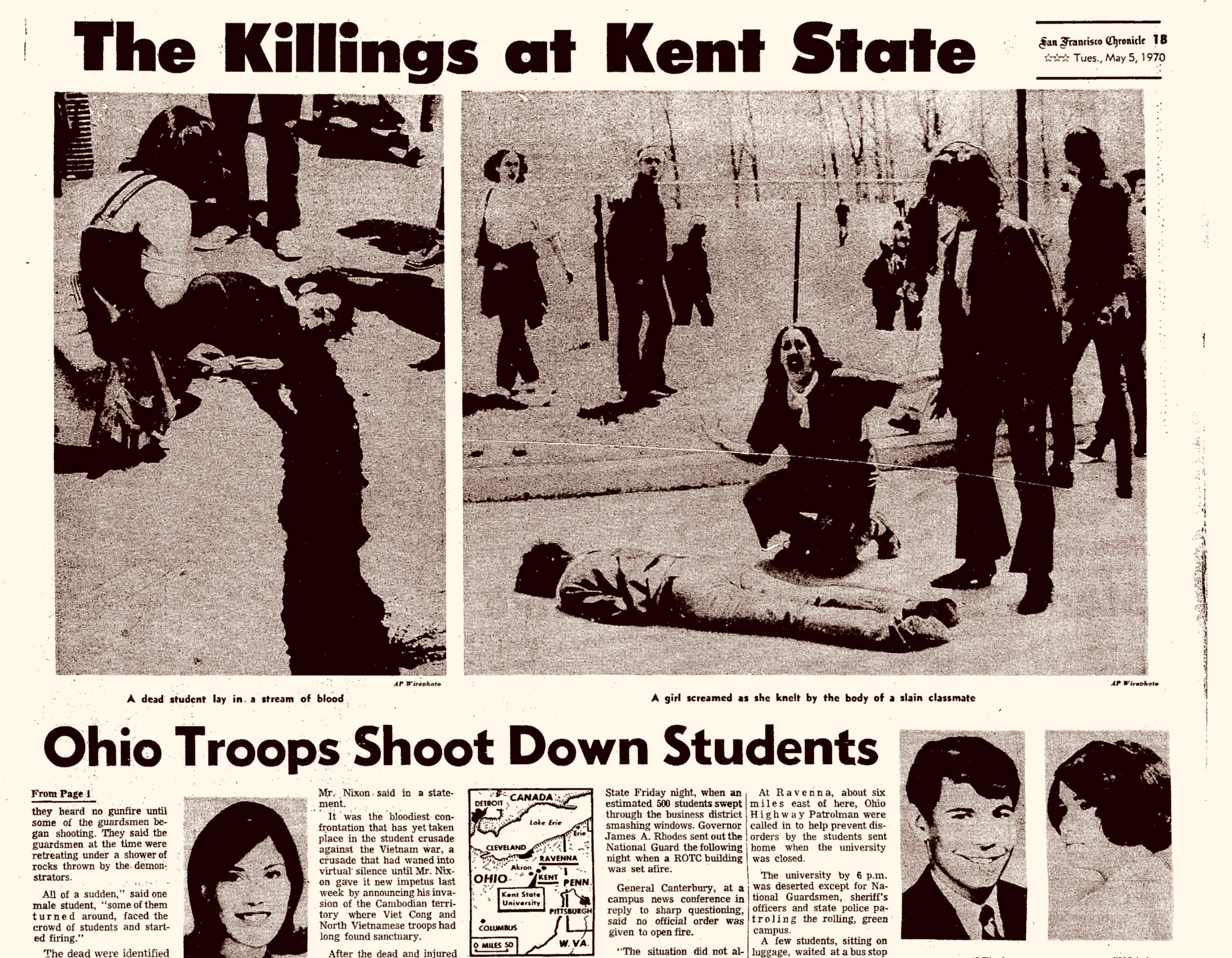 Billie picked up the newspaper that now lay on the chenille bedspread. She snap-tossed it like a Frisbee and some pages spun out around the room, but the front section hit Darlene in the chest and fell to the floor. She scooped it up and held the paper out in front of her. I craned my neck up and down, right and left and around her inflated hair and saw it was the San Francisco Sentinel, evening edition. Then I caught the huge headline above the fold: Four Kent State Students Dead as Troops Open Fire.