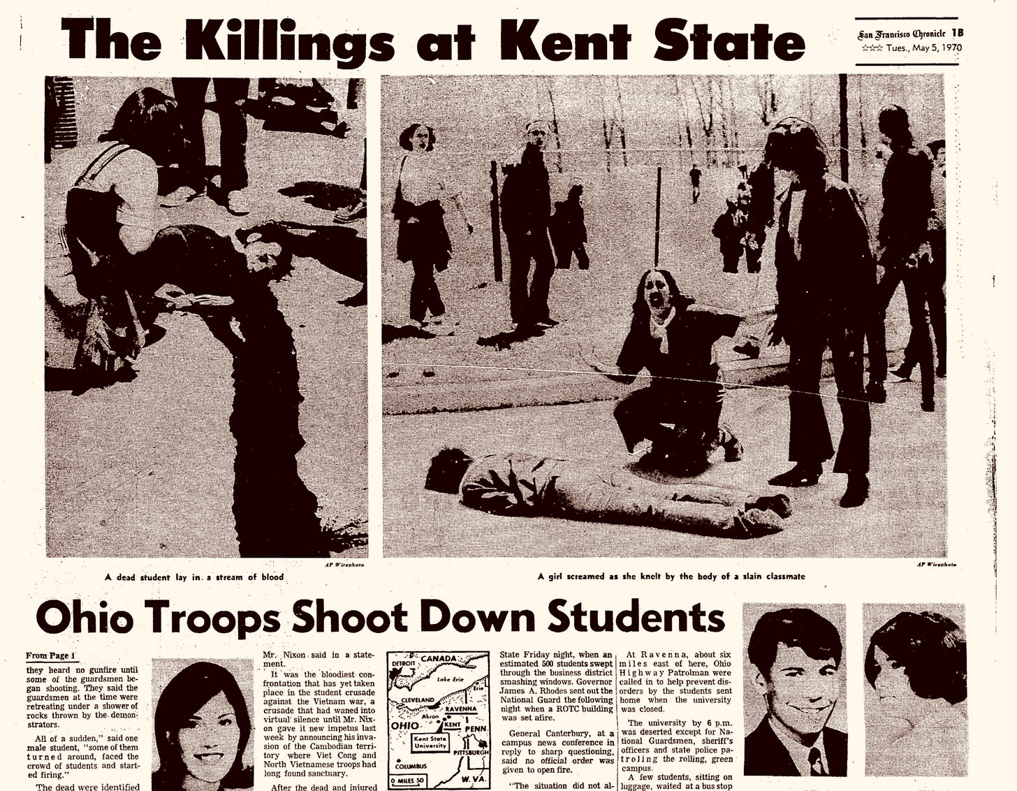This gunpowder thread of death had been in the news most of my life. JFK, Dr. King, Bobby, My Lai, black body bags and flag-draped caskets moving across the TV screen behind breathless reporters. But this felt different. Allison Krause, 19. Jeffrey Miller, 20. Sandy Lee Scheuer, 20. William Schroeder, 19. The names captioned under their high school yearbook photos.