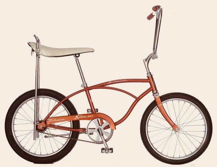 I’d pedaled for what felt like an hour, but I wasn’t halfway there. If you’re riding in a car, a long steady incline goes by in the window almost like flat ground, but on a one-speed Schwinn Sting-Ray the same stretch of road is a thigh-burning test of manhood.