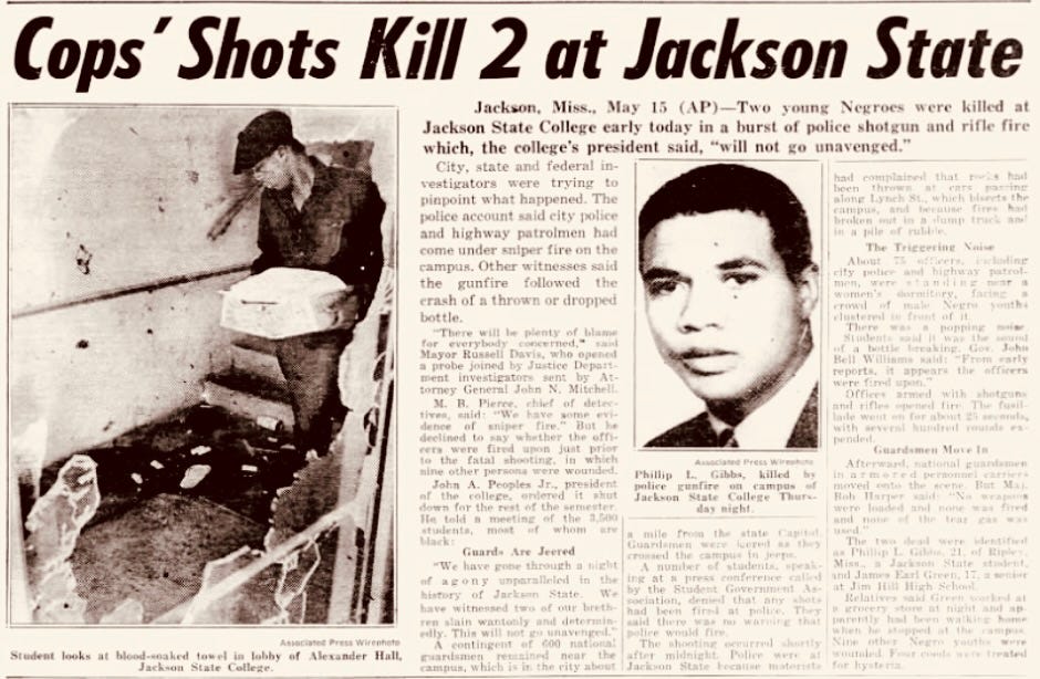 On the radio a newsman said two more students had been shot early that morning during an anti-war demonstration at Jackson State University in Mississippi. At first he said “two Negro men were killed,” and did not give their names. Later in the broadcast he identified them as twenty-one-year-old law student Phillip Gibbs and seventeen-year-old high school student James Green. “Men, my black hairy ass!” said Vic. “Jesus-goddamn-Christ! Couple schoolboys is more like it.”