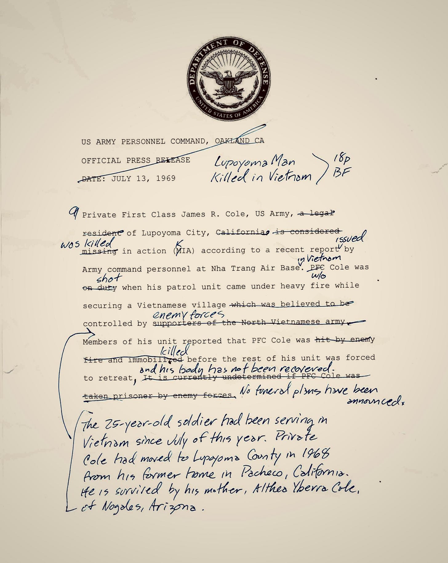 Private First Class James R. Cole, US Army, a legal resident of Lupoyoma City, California, is considered missing in action (MIA) according to a recent report by Army command personnel at Nha Trang Air Base. PFC Cole was on duty when his patrol unit came under heavy fire while securing a Vietnamese village which was believed to be controlled by supporters of the North Vietnamese army. Members of his unit reported that PFC Cole was hit by enemy fire and immobilized before the rest of his unit was forced to retreat. It is currently undetermined if PFC Cole was taken prisoner by enemy forces.